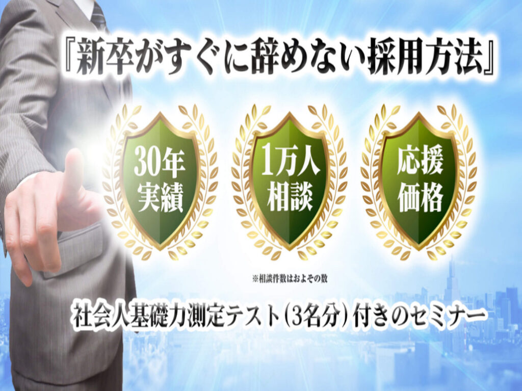 / 最終更新日時 : author 新着情報 (2021.8.24)即導入!「新卒がすぐに辞めない採用方法」の特設ページができました! 即導入!「新卒がすぐに辞めない採用方法」は、社会人基礎力測定テストを使用した新卒者選抜法を、60分で伝授するセミナーです。 詳細下記から! 新卒がすぐに辞めない採用方法 FacebookXBlueskyCopy コメントを残すメールアドレスが公開されることはありません。 ※ が付いている欄は必須項目ですコメント ※ 名前 メール サイト 上に表示された文字を入力してください。 Δ