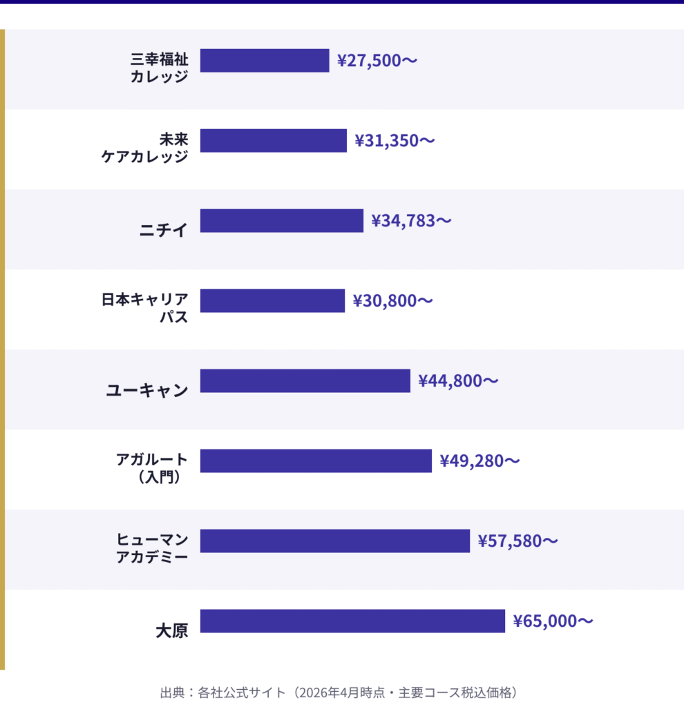 ※受講料はすべて税込の主要コース価格。キャンペーン価格は含まない。ニチイは通信コース・一括払い・教材費込の価格。ヒューマンアカデミーは分割払い例。