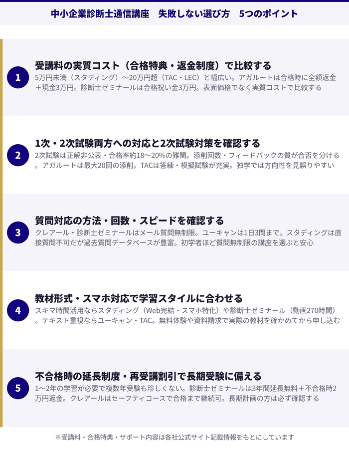 コスト重視ならスタディング・診断士ゼミナール、2次試験の添削サポートと合格率を重視するならアガルートアカデミーやTAC、長期受験に備えた保証制度を求めるなら診断士ゼミナール(3年延長無料)やクレアール(セーフティコース)が強みを持ちます。