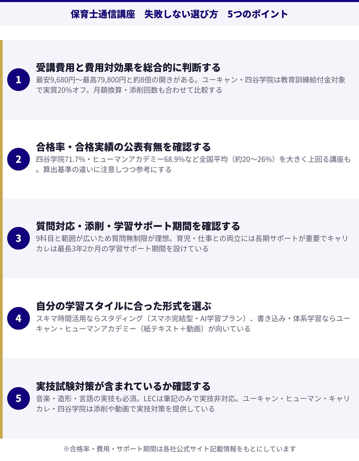保育士通信講座を選ぶ際は、費用・合格率・サポート期間・実技対策の有無という4つの軸が特に重要です。