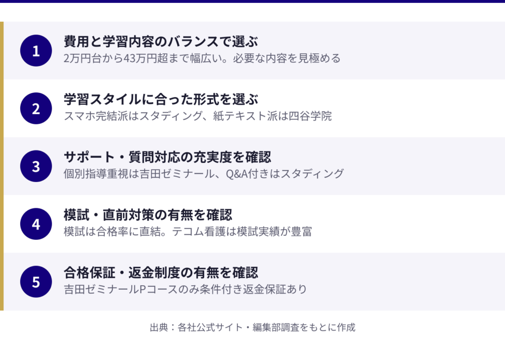 費用を抑えてスキマ時間に学びたい方はスタディングや四谷学院、紙テキストで丁寧に学習したい方は四谷学院、手厚い個別サポートや返金保証を求める方は吉田ゼミナール、低価格で質の高い動画インプットを求める方はテコム看護、専門校ならではの体系的な指導を求める方はさわ研究所が向いています。