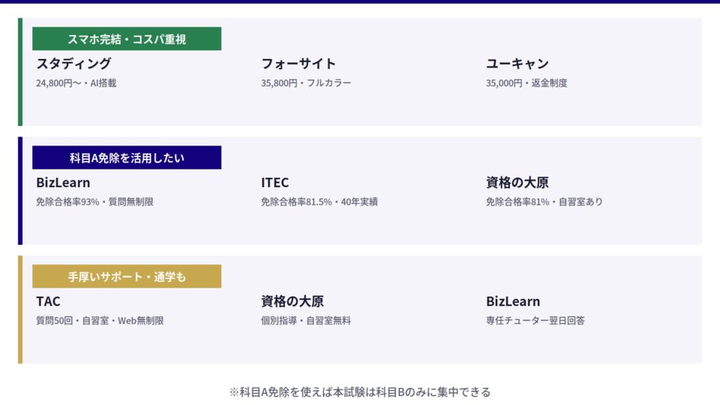 コスパ重視のスキマ学習ならスタディング、フルカラーテキストと教育訓練給付金を活用したいならフォーサイト、科目A免除と無制限サポートを求めるならBizLearnが有力です。