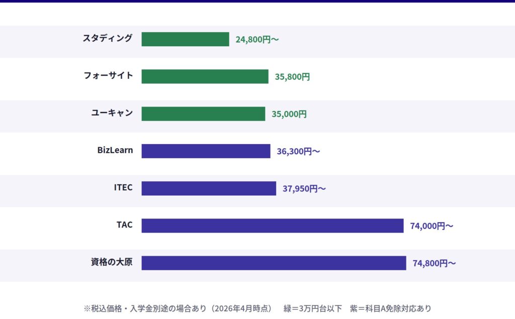 • スタディング・フォーサイト・BizLearn・ITEC・資格の大原・TAC・ユーキャンなど主要7社の受講費用・サポート体制・科目A免除対応の有無を一覧で比較できます