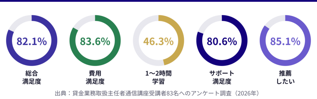 - 受講者67名への実際のアンケート調査データをもとに、通信講座の総合満足度・費用対効果・サポート体制への評価など、リアルな受講者の声を数字で確認できます