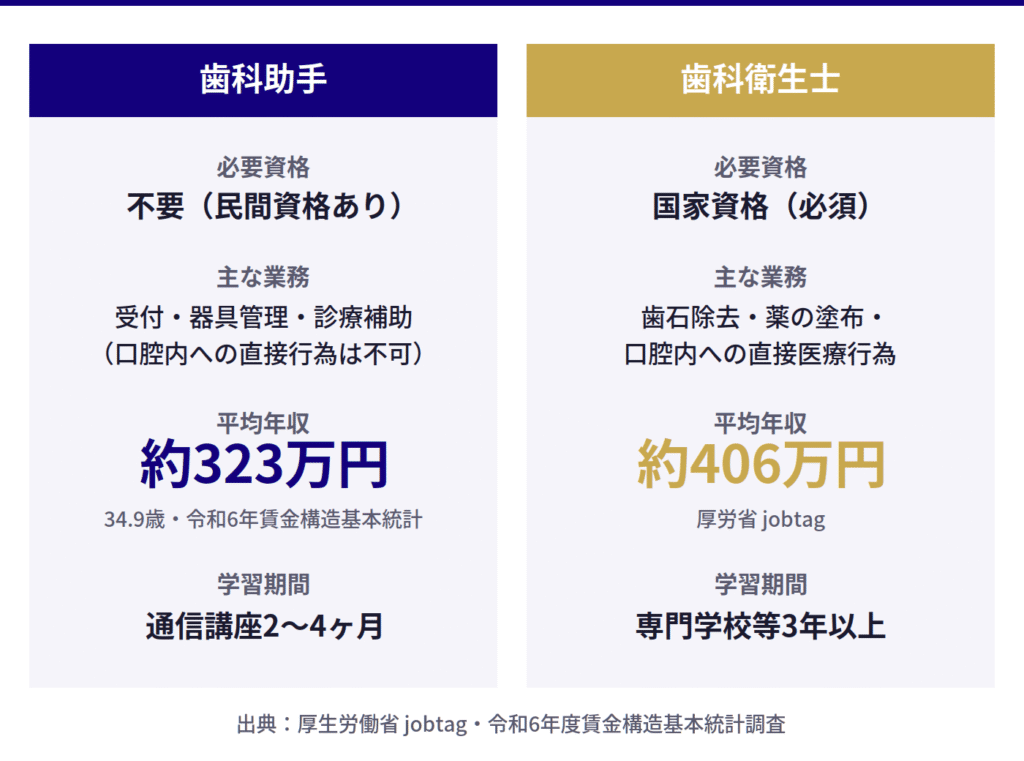 厚生労働省の職業情報提供サイト「job tag」によると、歯科衛生士の平均年収は約405.6万円であるのに対し、歯科助手の平均年収は令和6年度賃金構造基本統計調査で34.9歳・323万円前後という水準です。