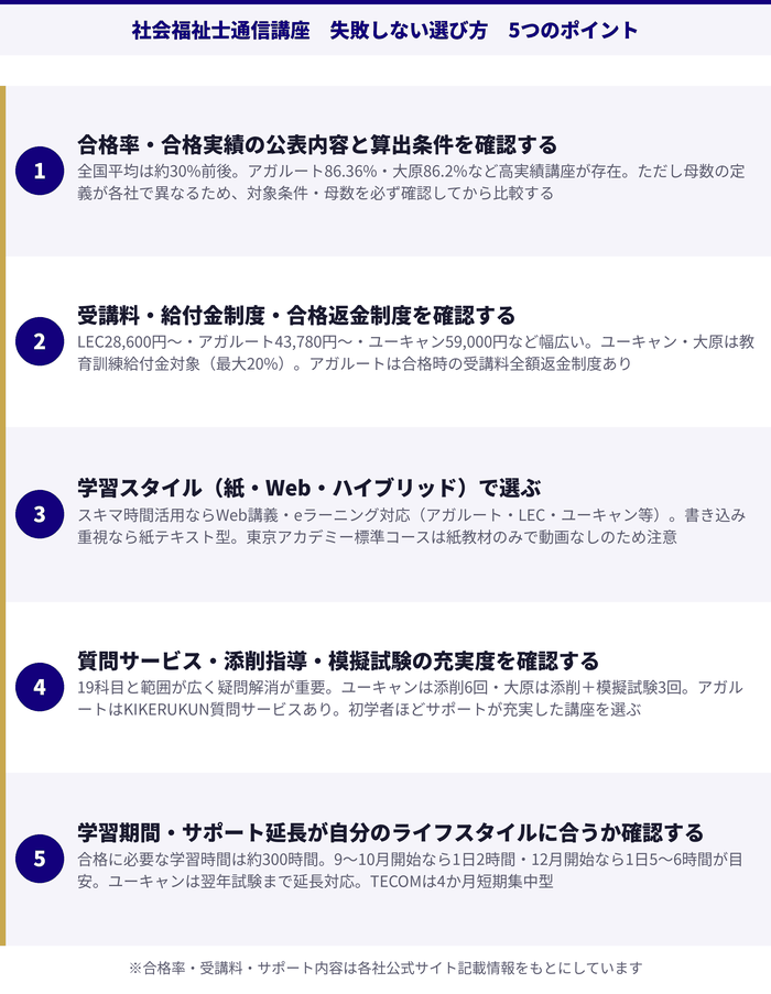 - 費用・学習スタイル・質問対応・模擬試験の有無など、通信講座を選ぶ際に本当に重要な5つのポイントとその見極め方がわかります