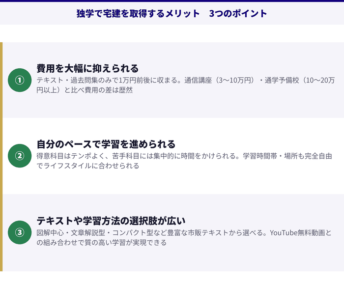 宅建の勉強方法を選ぶとき、独学・通信講座・通学(予備校)という3つの選択肢が存在します。その中でも独学を選ぶ人が一定数いるのは、独学ならではの魅力があるからです。とはいえ、メリットだけを見て「独学で十分」と判断するのは少し早いかもしれません。デメリットも正直に把握したうえで、自分に合った学習方法を選ぶとよいでしょう。