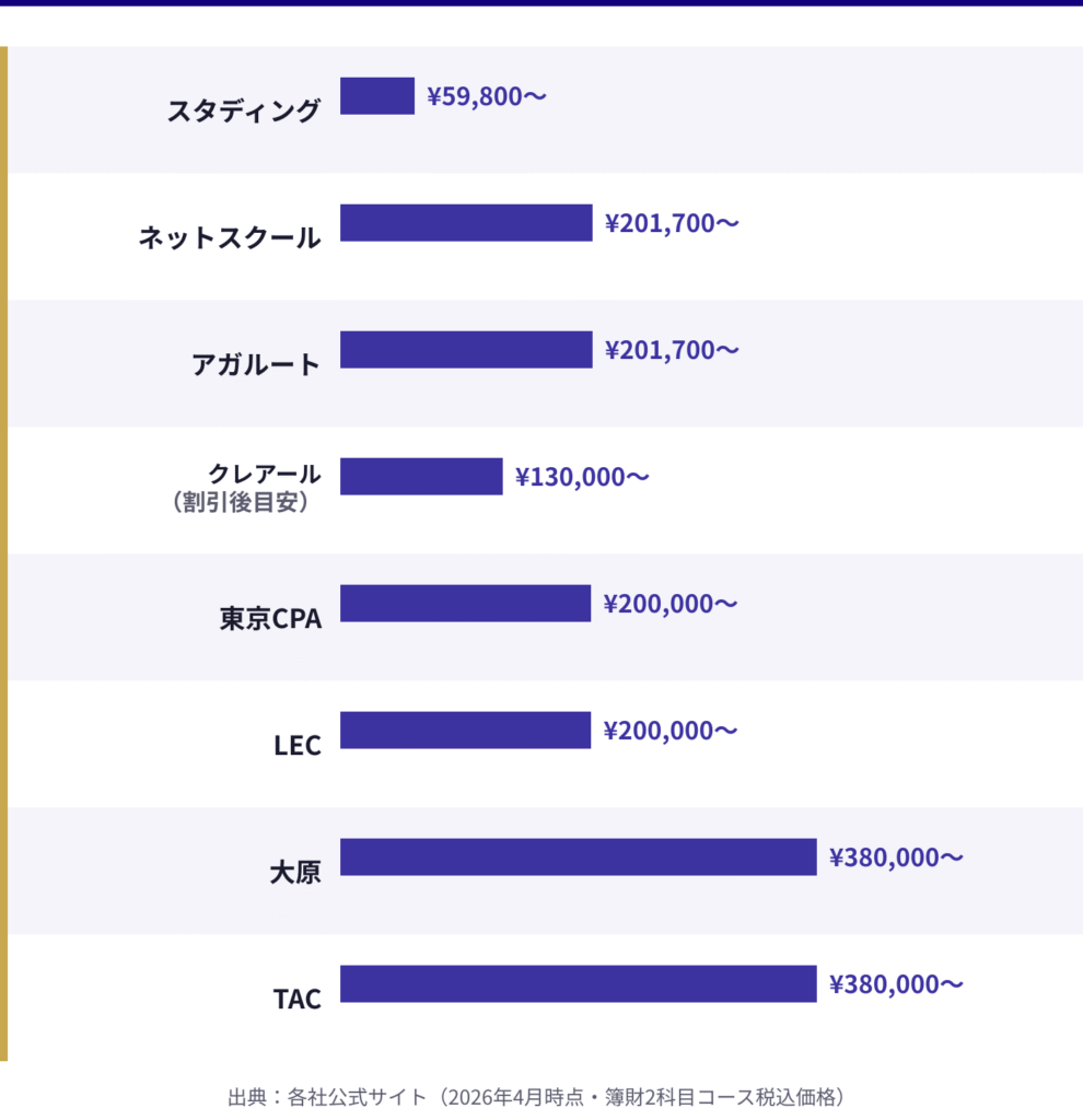 • スタディング・クレアール・資格の大原・TAC・LEC・ネットスクール・アガルート・東京CPA会計学院の8社を費用・質問サポート・対応科目・合格実績などの観点から徹底比較し、自分に合う講座を選ぶための判断基準が得られます
