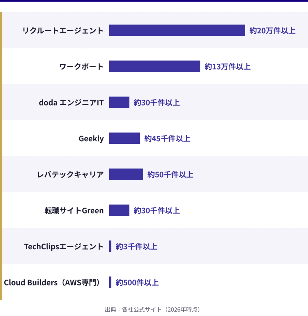 取り扱う求人数は45,000件以上(2026年2月時点)と業界でも屈指の規模を誇り、クラウドエンジニアを含むインフラエンジニア・バックエンドエンジニア・フロントエンドエンジニアなど幅広いIT職種の求人を保有しています。