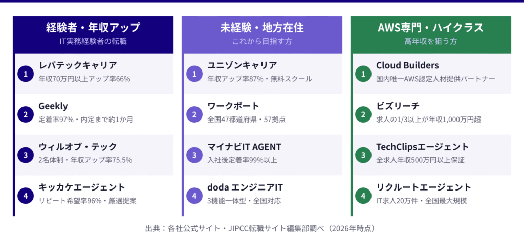 - 経験者向け・未経験者向け・AWS専門特化・ハイクラス向けなど、自分の状況に合った転職サービスの選び方と使い分け方がわかります