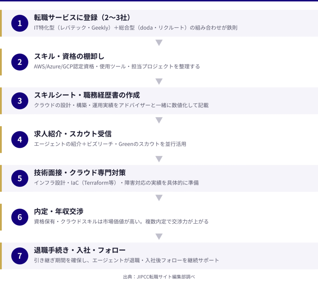 ここでは、転職サービスの登録から内定・入社後まで、クラウドエンジニアならではの流れを詳しく解説します。
