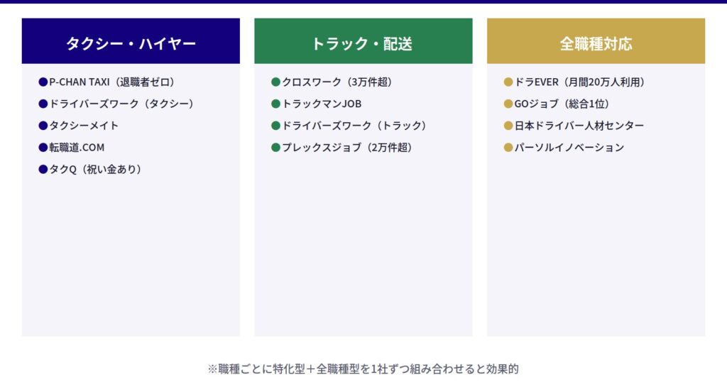 職種に応じて、タクシー系はP-CHAN TAXIやタクシーメイト・転職道COM、トラック系はクロスワーク・トラックマンJOB、全職種ならドラEVER・GOジョブが特におすすめです。複数サービスの併用が転職成功率を高めます。