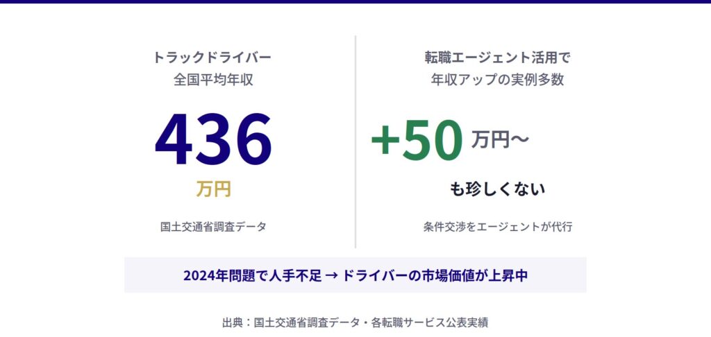 国土交通省の調査によると、トラックドライバーの平均年収は約436万円ですが、転職サービスを活用した場合、年収50万円以上アップの事例も珍しくありません。