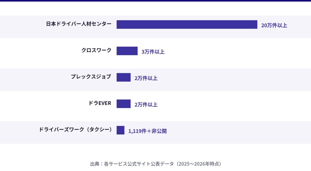 累計登録者数は100万人を超え、ドライバー職だけで2万件以上の求人を保有する業界最大級の規模を誇ります。