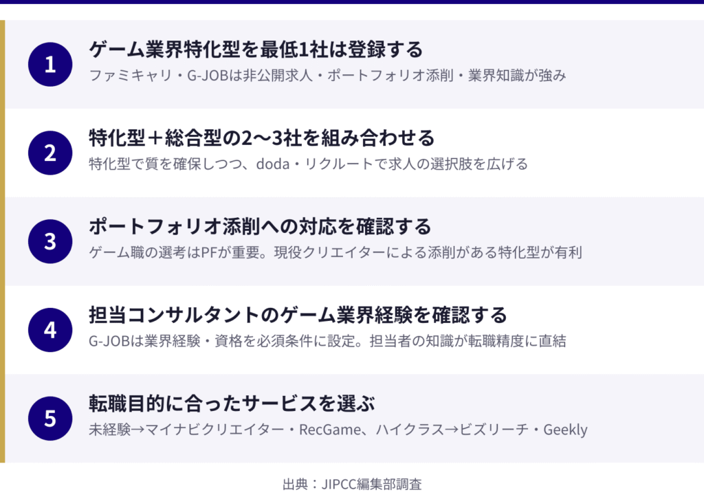 ゲーム職種の専門知識を持つ特化型エージェント(ファミキャリ・シリコンスタジオエージェント・G-JOBエージェントなど)を軸に、求人数の多い総合型エージェント(リクルートエージェント・doda・ワークポートなど)を並行利用するのがおすすめです。