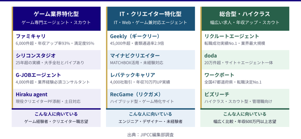 - ゲーム業界特化型から総合型まで、おすすめの転職サイト・転職エージェント14社を徹底比較した結果と、自分に合ったサービスの選び方がわかります。