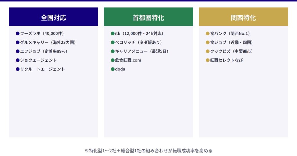 | 食バンク | 無料 | 関西圏(大阪・神戸・京都) | 2,000件以上 | 関西特化型エージェント+求人サイト | あり | あり | 関西No.1求人数・1万人以上の転職支援実績 |