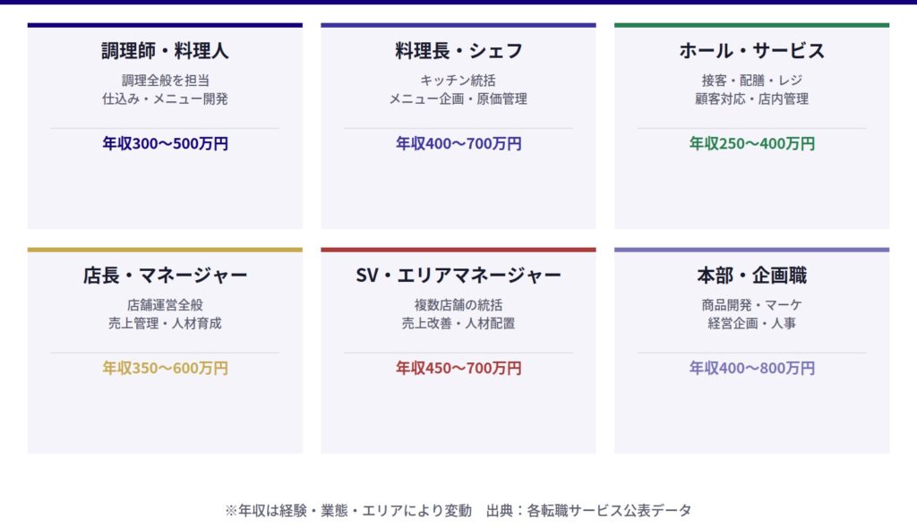- 飲食業界への転職を検討する際に必要な基礎知識(業態の種類・職種・資格・労働環境・年収相場など)をまとめて学べます