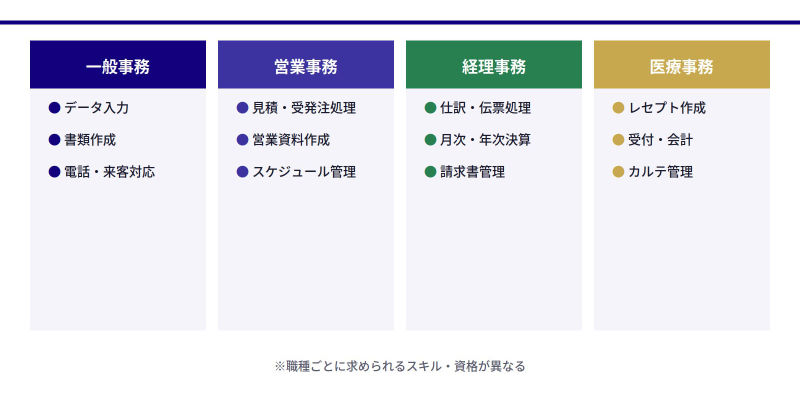 - 一般事務・営業事務・経理事務・医療事務など事務職の種類ごとの仕事内容や必要スキル、転職難易度の違いがわかります