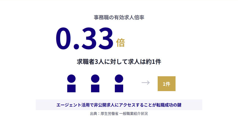 これは、求職者1人に対して求人が約0.33件しかないことを意味しており、事務職への転職がいかに競争率の高いものであるかを示しています。