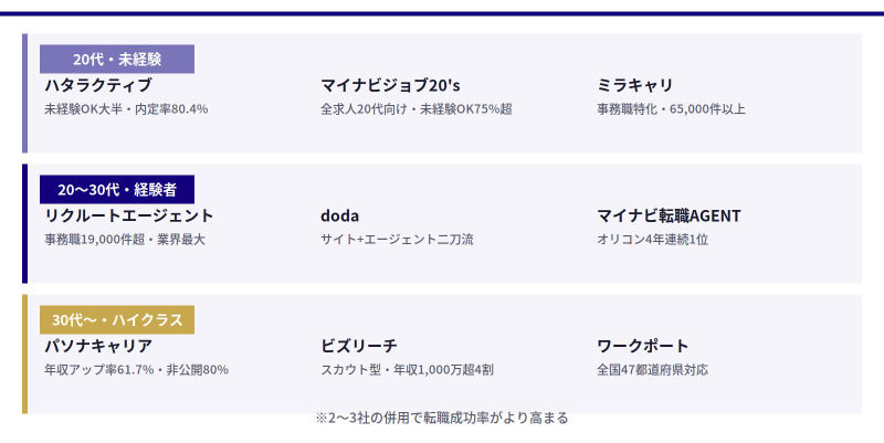 事務職転職で利用できるサービスは、大手総合型・若手特化型・事務職特化型に大別されます。