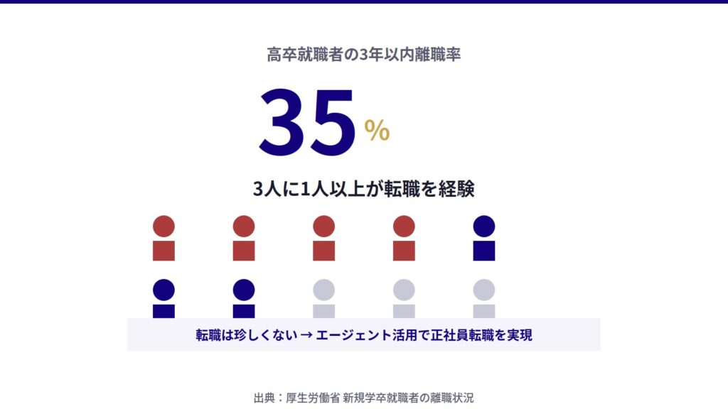 厚生労働省の調査によると、高卒就職者の3年以内の離職率は約35%にのぼります。つまり、3人に1人以上が転職を経験しているのが現状です。