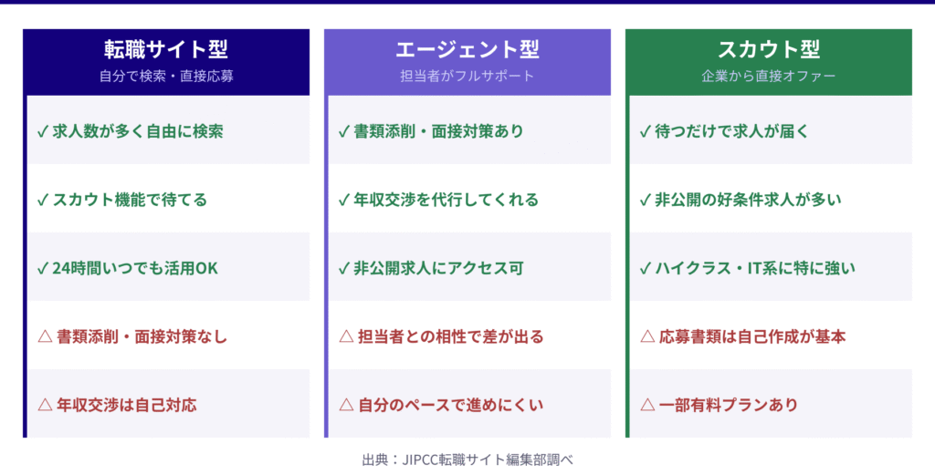 転職支援サービスには大きく分けて3種類あります。それぞれの仕組みと違いを正確に理解することが、転職活動の第一歩となります。