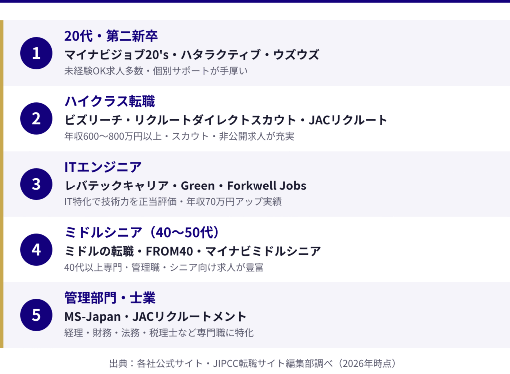 - 転職サイト・転職エージェント・スカウト型など種別ごとの違いと、自分の年代・職種・状況に合ったサービスの選び方がわかります。