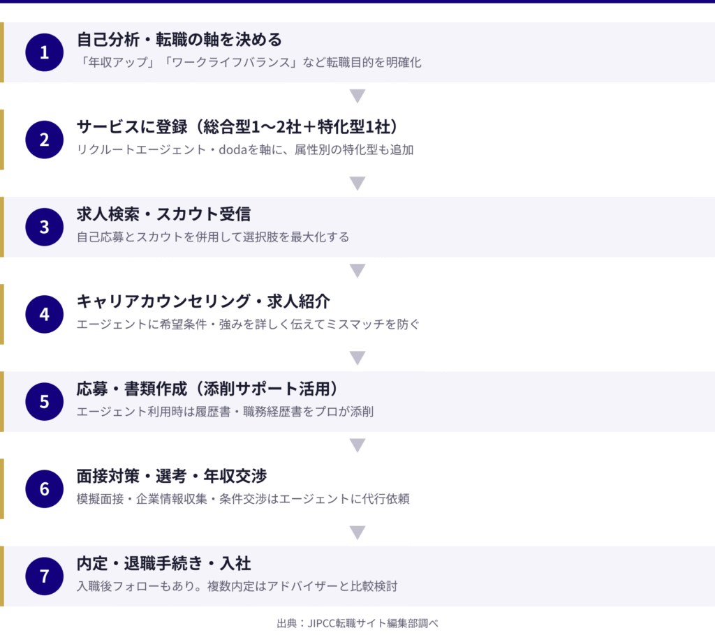 転職サイトを初めて使う方や、過去に使ったけれど思うような結果が出なかったという方に向けて、転職サイトを最大限に活用するための流れをSTEP別に解説します。