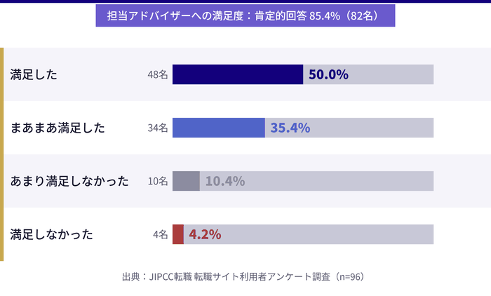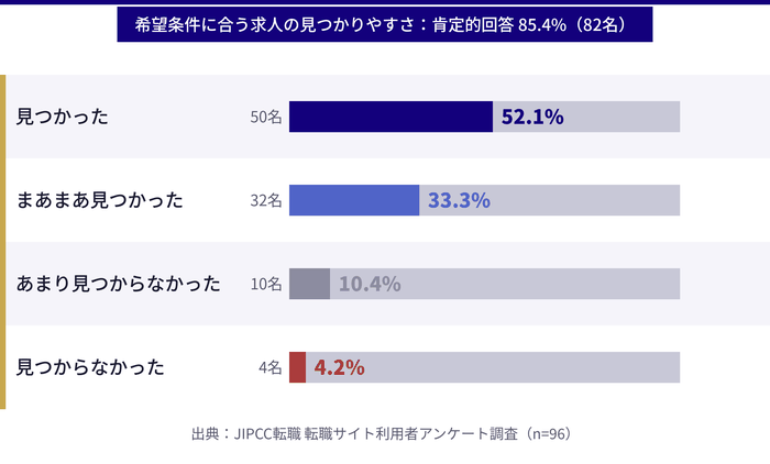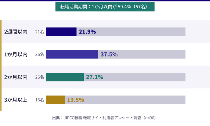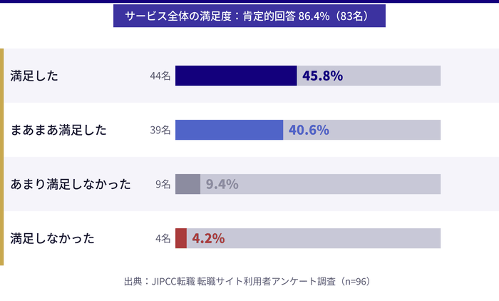 - 実際の利用者へのアンケート調査結果(有効回答96名)をもとに、満足度・転職期間・利用実態などリアルなデータに基づいた転職活動の全体像が理解できます。