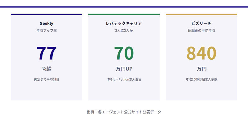 利用者の80%が転職後に年収アップを実現しているというデータも、Pythonエンジニアにとって心強い実績といえます。