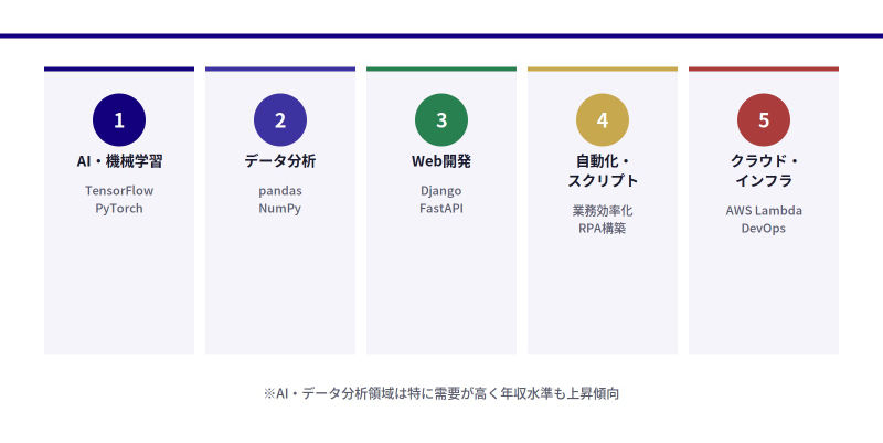 Pythonはデータサイエンスや機械学習、Web開発など活用範囲が広く、需要が特に旺盛なスキルとして注目されています。