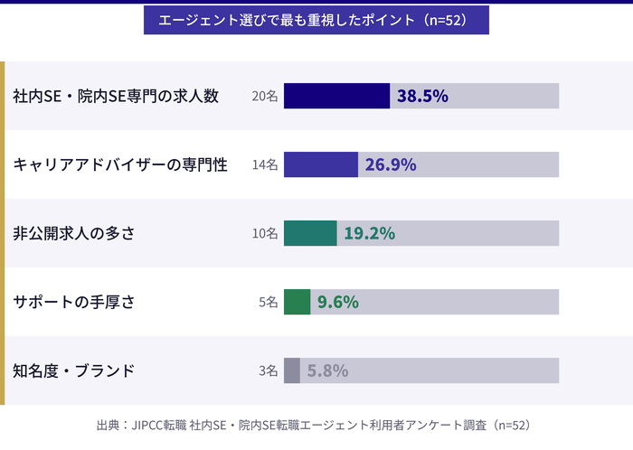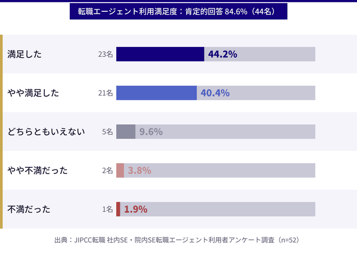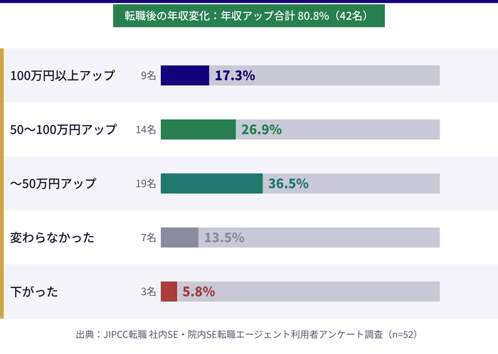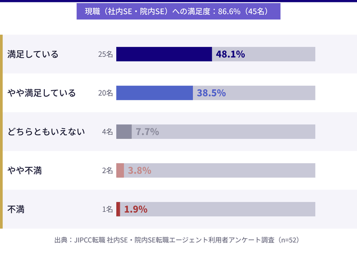 • 実際に社内SE・院内SE転職を経験した52名へのアンケート調査から、転職活動の期間・年収変化・サービス満足度などリアルなデータを確認できます