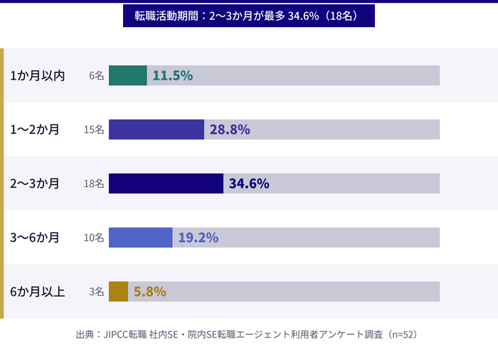 今回実施したアンケート調査では、転職活動開始から内定まで2〜3ヶ月かかった方が34.6%と最多でした。
