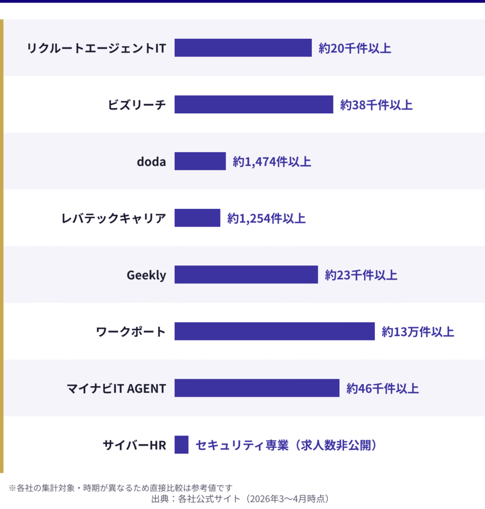 公式サイトでは求人数が30,000件以上と公開されており、そのうちセキュリティエンジニアの求人は1,254件(2026年3月時点)と、IT特化型エージェントの中でも豊富な専門求人を保有しています。