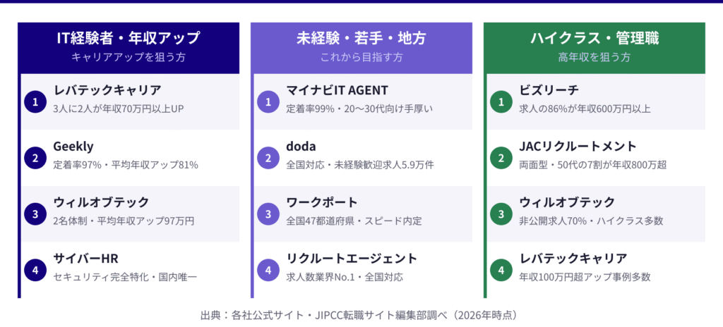求人数の規模ではリクルートエージェントIT・ビズリーチ・dodaが突出しており、年収アップ実績ではウィルオブテックとJACリクルートメントが際立っています。