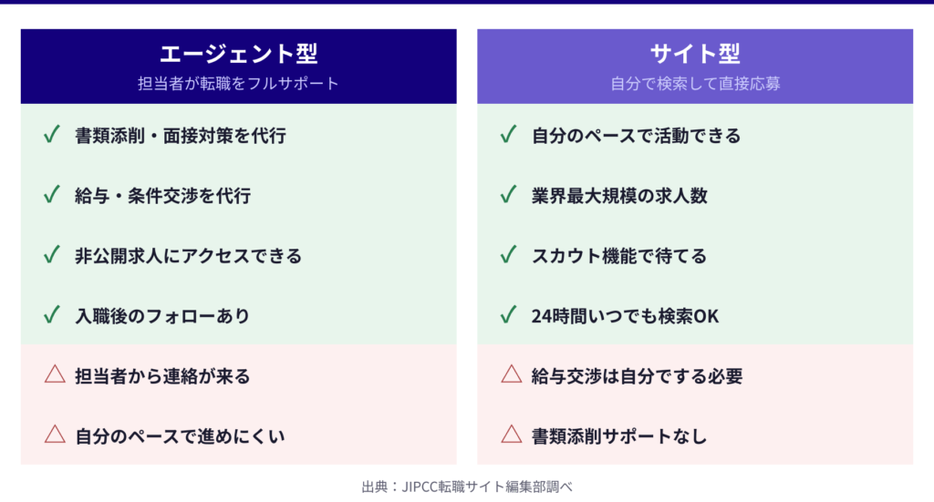 どちらか一方に絞る必要はなく、エージェント型でサポートを受けながら、サイト型で求人の幅を広げる使い方が転職成功率を高めるうえで有効です。