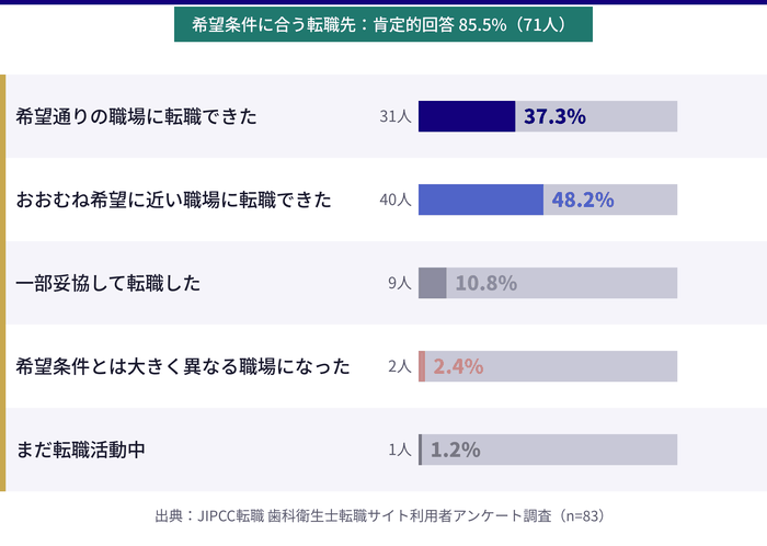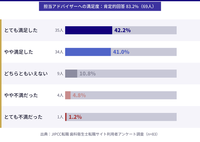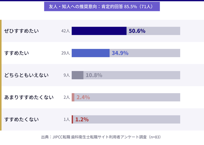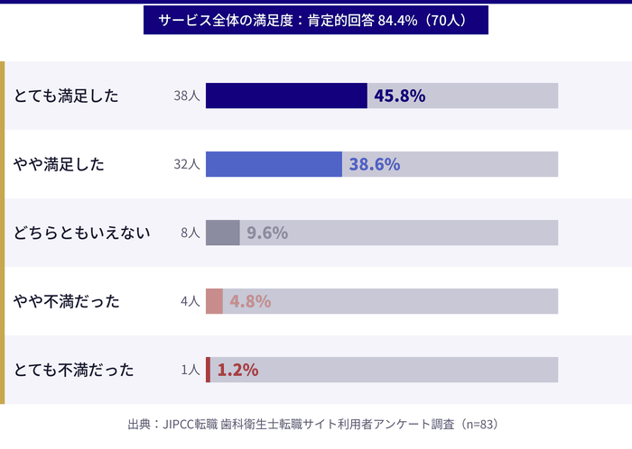 - 実際に転職サイトを利用した歯科衛生士83人へのアンケート調査をもとに、求人数・担当者サポート・希望条件の合致度・転職期間・推奨意向の5項目における満足度のリアルなデータが確認できます。