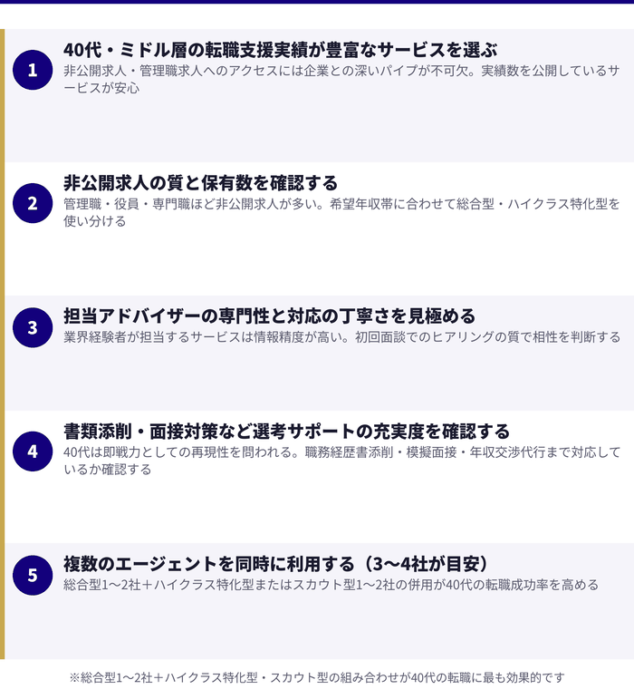 - 40代転職エージェントの選び方|失敗しないための5つのポイント