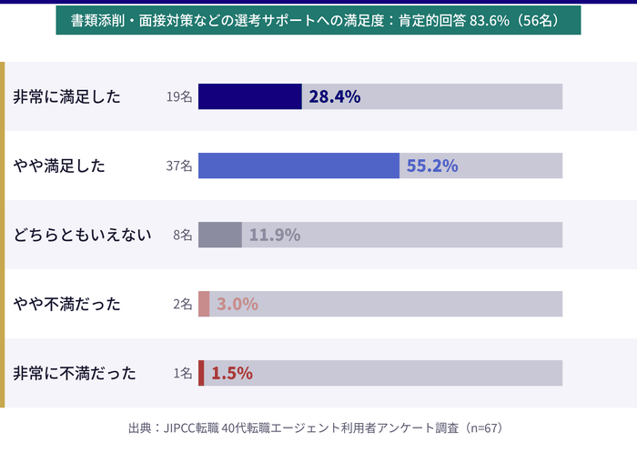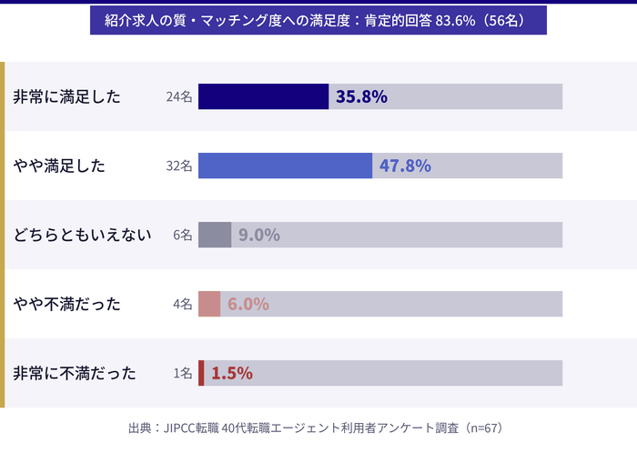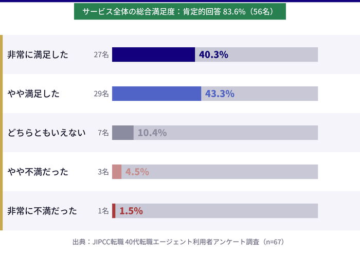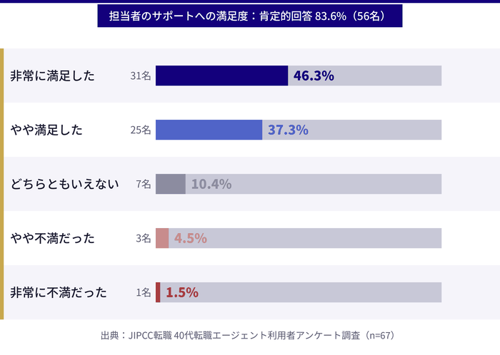 - 実際に40代の転職エージェント利用者67名へのアンケート調査をもとに、担当者サポートの満足度や求人の質・選考サポートに関するリアルなデータを確認できる