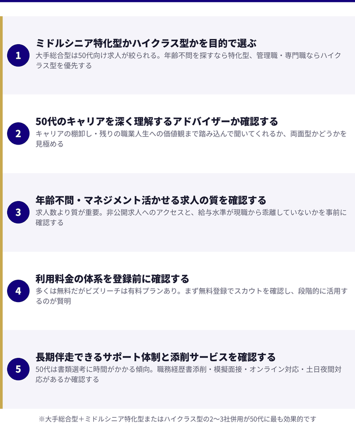 - 50代転職エージェントの選び方|失敗しないための5つのポイント