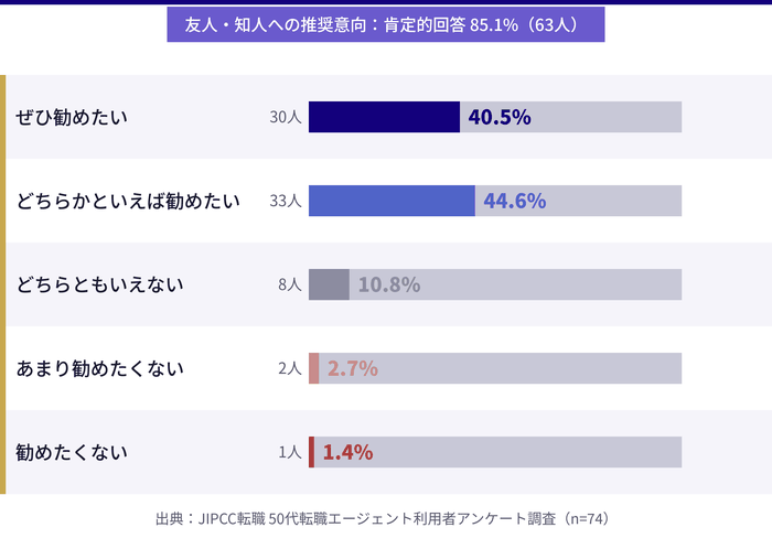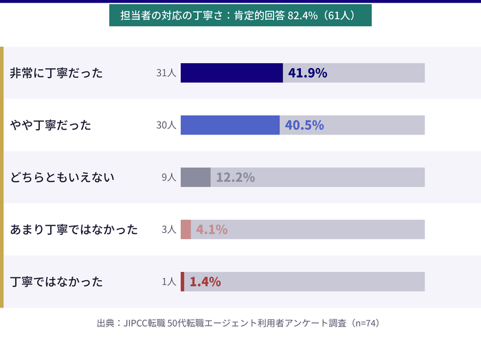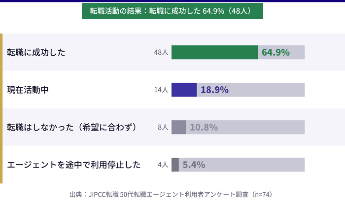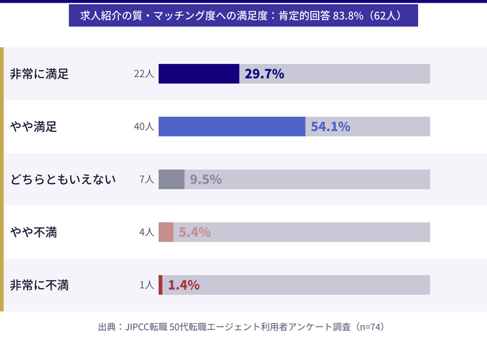 - 実際の50代転職エージェント利用者74名へのアンケート調査結果から、担当者の対応満足度・求人の質・内定成功率といったリアルな声を確認できます。転職エージェントを選ぶ際の参考として活用できる生のデータです。