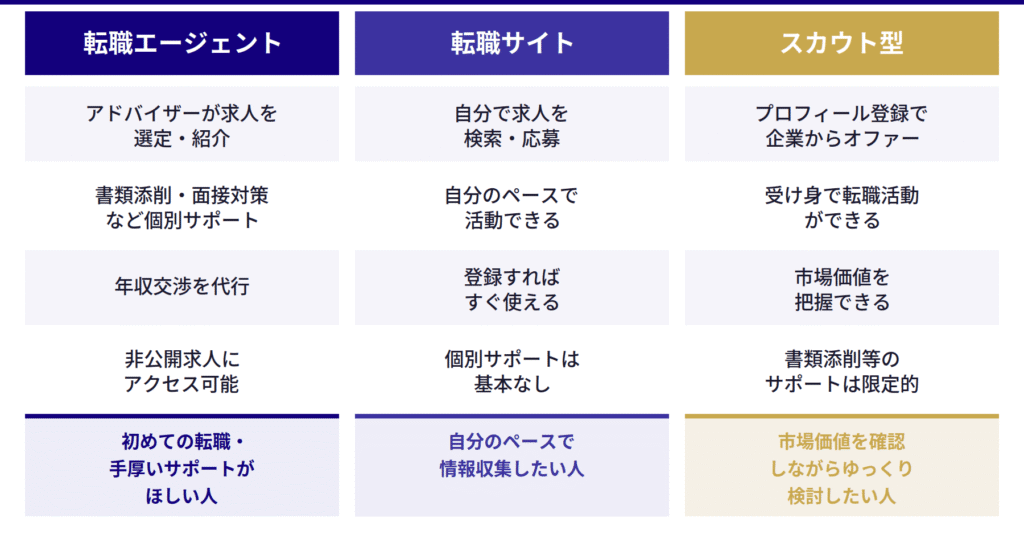 ハイクラスにはJACリクルートメントやリクルートダイレクトスカウト、20代には第二新卒エージェントneoやハタラクティブ、IT系にはレバテックキャリアやGeekly、外資系にはエンワールドやロバート・ウォルターズと、自分の状況に合ったサービスを2〜3社組み合わせて利用するのが良いでしょう。