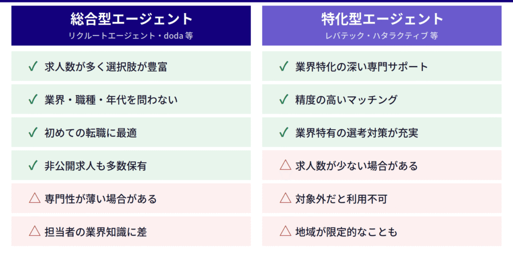 転職エージェントには「総合型」と「特化型」があり、それぞれ保有する求人や強みが異なります。1社だけに絞ると紹介される求人の幅が狭くなるため、2〜3社への同時登録が一般的です。総合型エージェント(リクルートエージェント・dodaなど)1〜2社と、自分の状況に合った特化型(IT特化・ハイクラス特化・20代特化など)1社という組み合わせが最も効果的です。