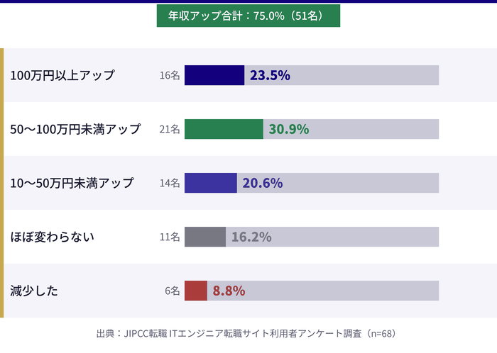 A転職サイト・エージェントを活用した際の年収アップ幅はサービスや個人のスキルによって大きく異なりますが、ITエンジニアは転職を通じた年収アップが実現しやすい職種の1つです。
