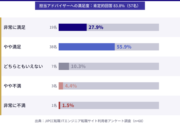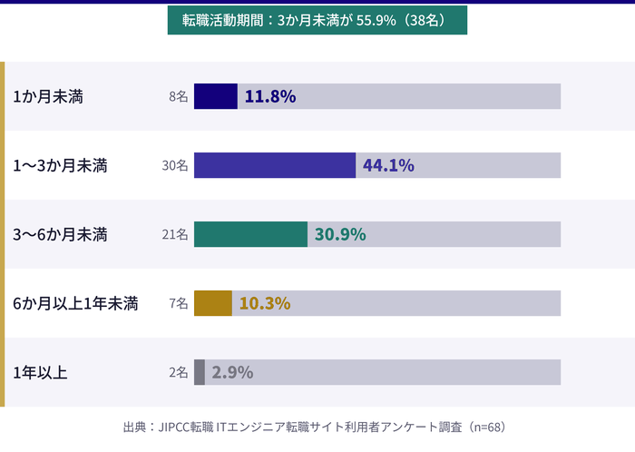 今回実施したアンケートでも、3ヶ月未満で内定を得た方が全体の55.9%を占めており、ITエンジニアは比較的スピーディーに転職を完了できる傾向があります。
