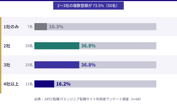 どちらか一方に絞る必要はなく、自分で求人を探す転職サイト型とエージェントを並行して利用するのが転職活動の効率を高めるうえで効果的です。今回のアンケートでも、2〜3社を並行利用した方が全体の73.6%を占めており、併用が一般的であることがわかりました。