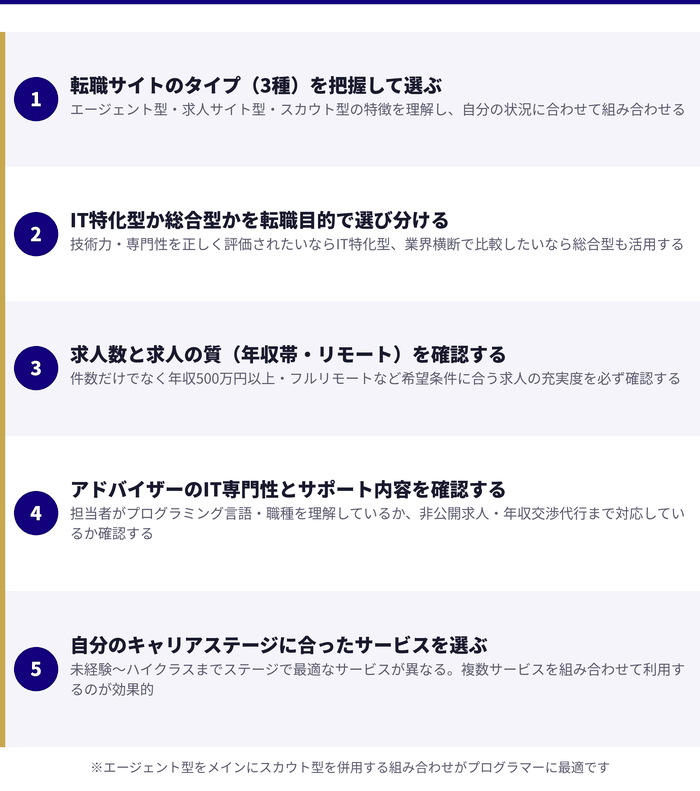 - プログラマー転職サイトの選び方|失敗しないための5つのポイント