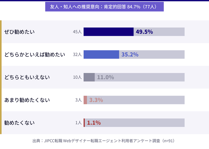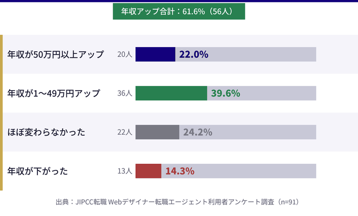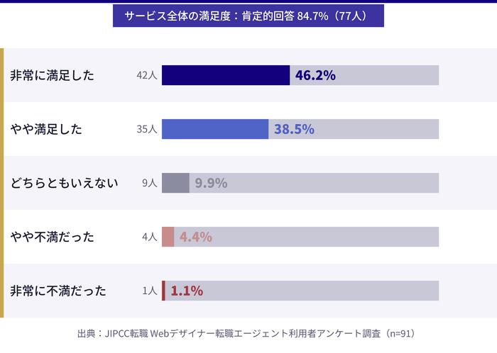 - 利用者91人へのアンケート調査をもとに、転職エージェント利用者の満足度・年収変化・転職にかかった期間などのリアルなデータを確認できます。