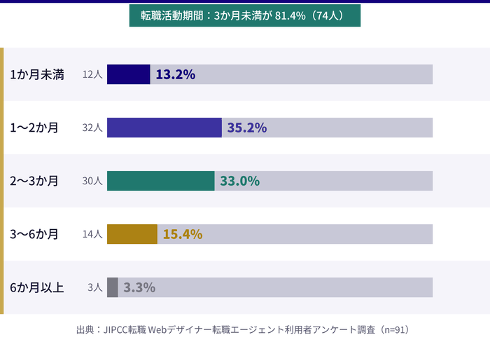興味のある求人に応募し、書類選考・筆記/実技テスト・面接(複数回の場合が多い)を経て内定となります。内定後はエージェントが年収・入社日などの条件交渉を代行し、最終的に入社という流れです。アンケート調査でも3ヶ月以内に転職を完了した方が81.3%を占めており、エージェントを活用することでスムーズな転職活動が実現できます。